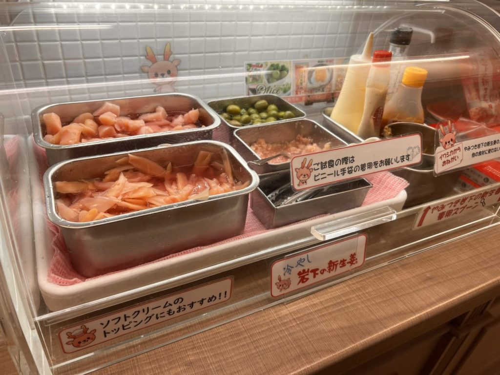 暑さの中で食べた生姜ソフトクリームは格別。ほんのり生姜の風味が効いていて、さっぱり美味しい一品でした。それにトッピングが出来るんですが、それこそ岩下の新生姜を無料で!刻みなど種類も豊富でした。